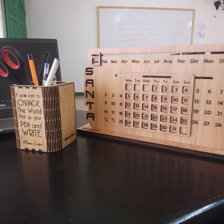 This is a masterclass in laser-cut precision. Crafted from premium wood with a natural grain, it features a sliding month selector and a floating date grid. Every detail is deeply etched into the wood to ensure it never fades.